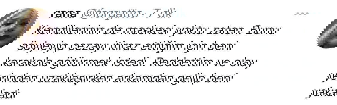 Olayla ilgili sosyal medya hesabından açıklama yapan Rana isimli kadın, "Kendilerinin de maskesi yoktu zaten. Bunu söyleyip cezayı itiraz ettiğim için beni karakola götürmek istedi. Reddettim ve olay yerinden uzaklaşırken arkamdan gelip beni yakaladı" ifadelerini kullandı.