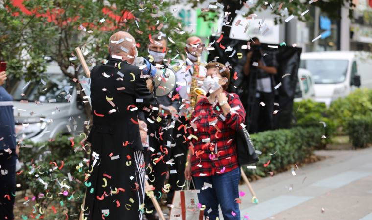 ‘Maskeni tak, sanatsız kalma’ adı altında yapılan sosyal deneyin yapıldığı alanda panoların arkasına saklanan şehir tiyatrosu oyuncusu, maskesini doğru bir şekilde takan vatandaşların önüne bandoyla çıkarak tiyatro bileti hediye etti.