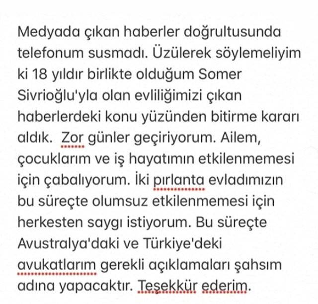 Zor günler geçiriyorum. Ailem, çocuklarım ve iş hayatımın etkilenmemesi için çabalıyorum. İki pırlanta evladımızın bu süreçte olumsuz etkilenmemesi için herkesten saygı istiyorum. Bu süreçte Avustralya'daki ve Türkiye'deki avukatlarım gerekli açıklamaları şahsım adına yapacaktır. Teşekkür ederim.