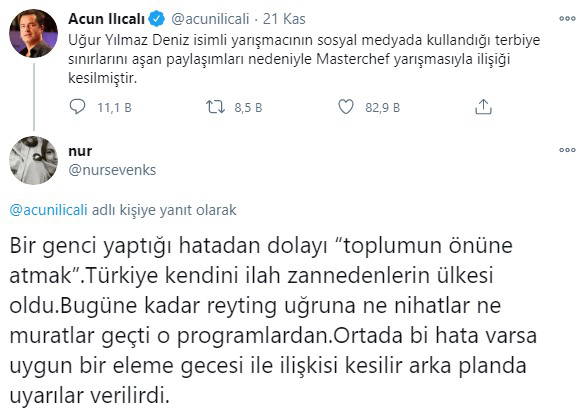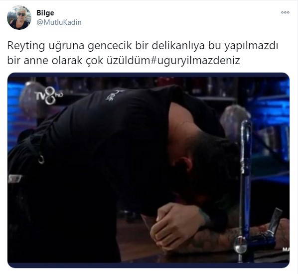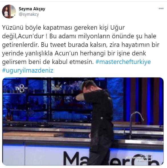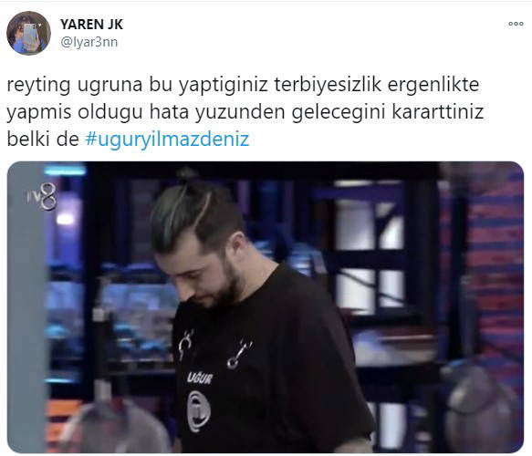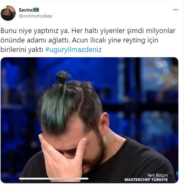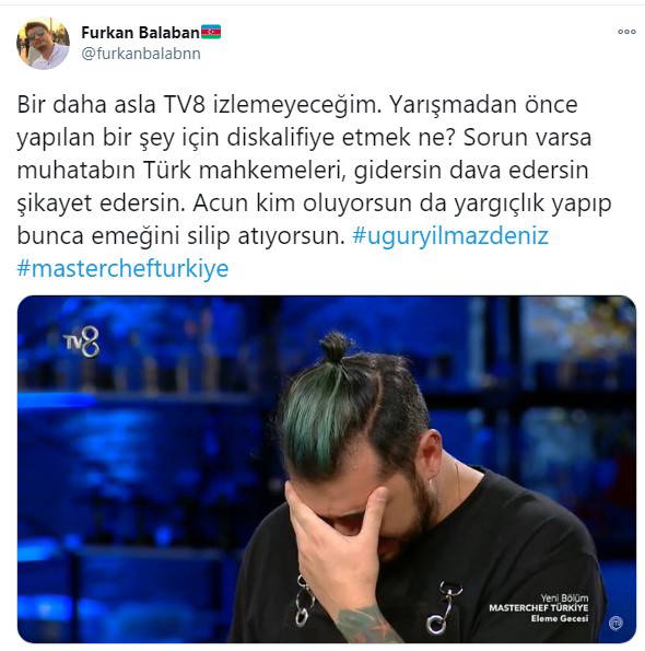 TV8'in sahibi Acun Ilıcalı, geçtiğimiz hafta sosyal medya hesabından yaptığı paylaşımda MasterChef Türkiye yarışmacılarından Uğur Yılmaz Deniz'in diskalifiye edildiğini söyledi. Dün akşam eleme bölümüyle ekrana gelen yarışmada ise Deniz'in diskalifiye edildiği anlar yayınlandı. 26 yaşındaki Deniz'in diskalifiye anlarının reyting için yayınlanması sosyal medyada tepkilere neden oldu