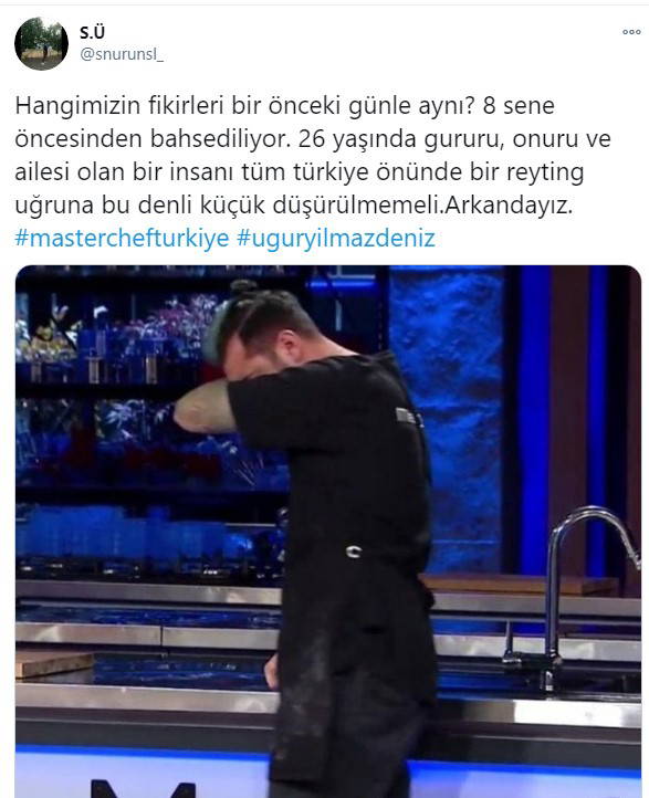 Yarışmanın yayınlanan bölümünün ardından Twitter ve Instagram hesaplarından açıklama yapan Uğur Yılmaz Deniz, şu ifadeleri kullandı: "Yemek yapmak yemek sunmak çocukluğumun hayaliydi. Hayallerimin peşinden giderken yolum hep yemeğe ve mutfağa çıktı. Bu masalsı zenginliğin içinde bir yandan hayallerinizin peşinden koşarken bir yandan da büyürsünüz. Ergenlik ve delikanlılık arasında bocalar durursunuz. Ve galiba bolca hata yaparsınız aynı benim gibi.Bizim jenerasyonumuzun hayatının bir parçası haline gelen sosyal medya işte bu ve buna benzer hatalar için bir başka zemin haline geliverir. Sosyal medyada gündeme gelen eski ve neredeyse çocukluk dönemlerimin bazı paylaşımları benim Masterchef hikayemin sonunu getirdi."
