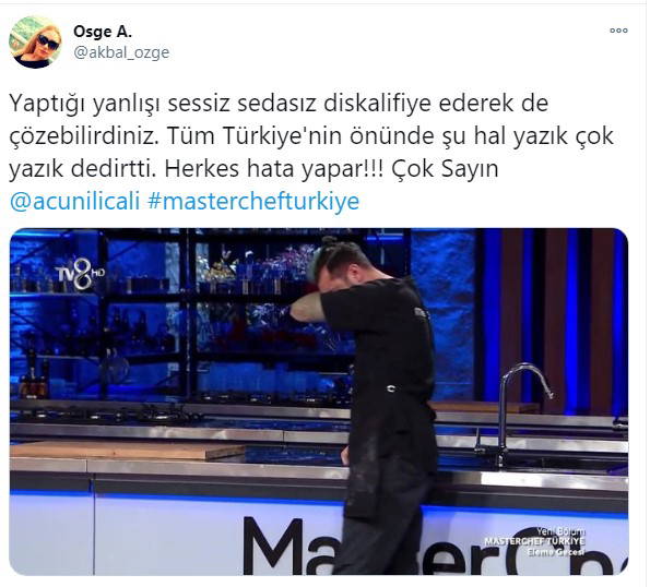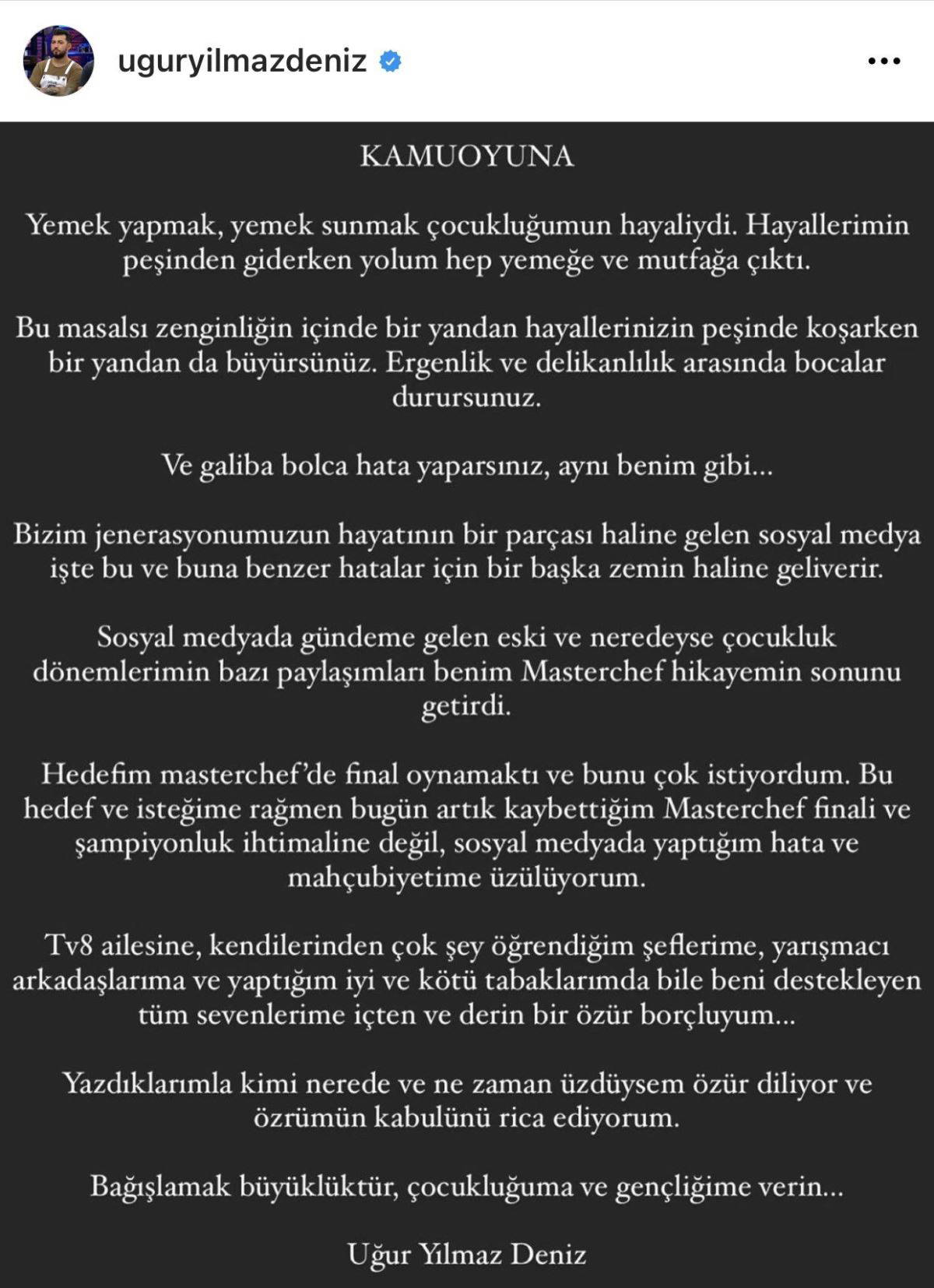 "Hedefim Masterchef'te final oynamaktı ve bunu çok istiyordum. Bu hedef ve isteğime rağmen bugün artık kaybettiğim Masterchef finali ve şampiyonluk ihtimali değil sosyal medyada yaptığım hata ve mahcubiyetime üzülüyorum. TV8 ailesine kendilerinden çok şey öğrendiğim şeflerime yarışmacı arkadaşlarıma ve yaptığım iyi ve kötü tabaklarımda bile beni destekleyen tüm sevenlerime içten ve derin bir özür borçluyum. Yazdıklarımla kimi nerede ve ne zaman üzdüysem özür diliyor ve özrümün kabulünü rica ediyorum. Bağışlamak büyüklüktür çocukluğuma ve gençliğime verin."
