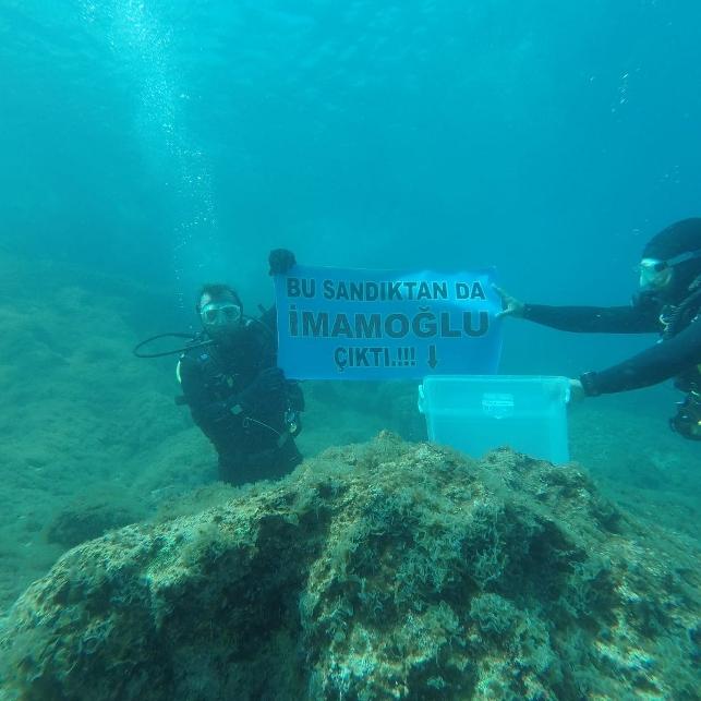 Suyun altında bulunan sandığı açan Erdemli ve dalgıç ekibi, üzerinde “Bu sandıktan da İmamoğlu çıktı” yazılı dövizi suyun altında dalgalandırdı.