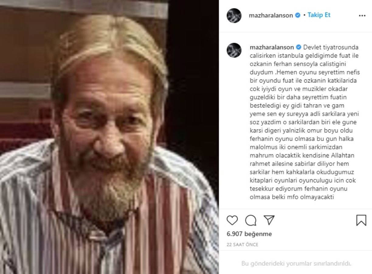 Şensoy'un ölümünün ardından pek çok sanatçı duygularını sosyal medya hesaplarından paylaştı. MFÖ grubunun üyelerinden Mazhar Alanson da o isimlerden biriydi.