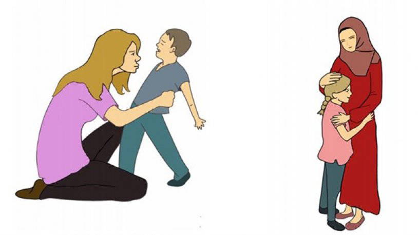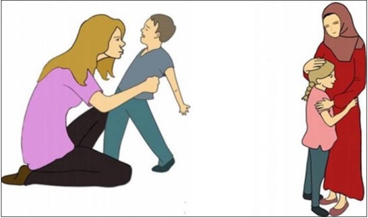 Kitapta bulunan, “Doğrular ve Yanlışlar” etkinliği altında da çocuğunu öpen, şefkatle sarılan anne görseli paylaşıldı. Görseldeki anne türbanlı şekilde yansıtıldı. Bir başka resimde ise çocuğu öpmeye çalışan başı açık yetişkin bir kadın ve bu girişim karşısında hoşnut olmayan çocuk anlatıldı. Bu resmin hemen altına ise çocuğunun başını okşayan kapalı bir annenin çizildiği resim yerleştirildi. Kitapta yer alan hikayelerin birinde ise sokakta oynayan çocuğun yanına gelen komşusunun onu öpmek istediği ifade edildi. Bu hikayenin görselinde de başı açık bir kadın tercih edildi.