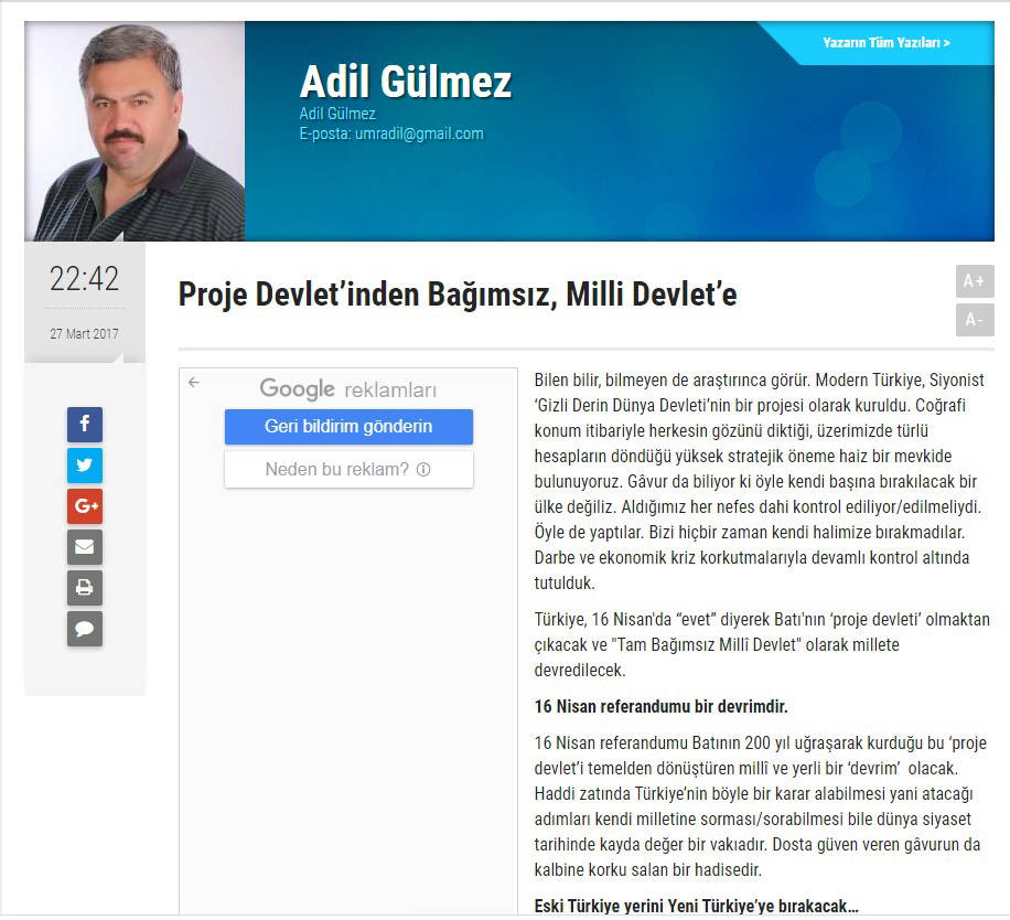 2017 yılında yayınlanan ve hala yayında olan "Proje Devlet’inden Bağımsız, Milli Devlet’e" başlıklı yazıda, “Bilen bilir, bilmeyen de araştırınca görür. Modern Türkiye, Siyonist ‘Gizli Derin Dünya Devleti’nin bir projesi olarak kuruldu", " Erdoğan’nın Batının en büyük pazarı ve can damarı olan "Eski Türkiye" yerine "Yeni Türkiye"yi kuracağını söylemesi Haçlı zihniyetinin ona savaş ilân etmesinin gerekçesi olduğunu bilmem, bilmeyen var mı? " gibi skandal ifadeler yer aldı.