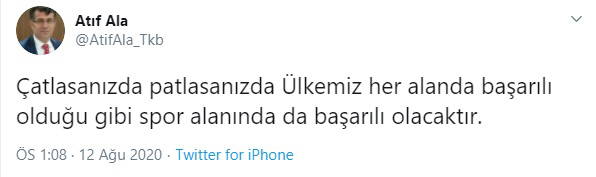 Başkan Ala paylaşımında "Çatlasanızda patlasanızda Ülkemiz her alanda başarılı olduğu gibi spor alanında da başarılı olacaktır." diye yazdı.