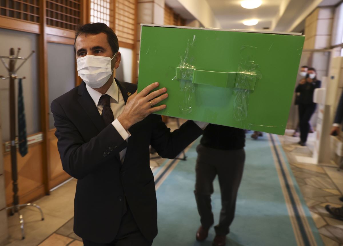 Topal, Meclis'te düzenlendiği basın toplantısına, Hatay'daki Covid-19 vakalarının artışına dikkati çekmek için tabut getirdi.