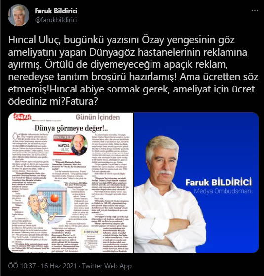 "Hıncal Uluç, bugünkü yazısını Özay yengesinin göz ameliyatını yapan Dünyagöz hastanelerinin reklamına ayırmış. Örtülü de diyemeyeceğim apaçık reklam, neredeyse tanıtım broşürü hazırlamış! Ama ücretten söz etmemiş! Hıncal abiye sormak gerek, ameliyat için ücret ödediniz mi? Fatura?"
