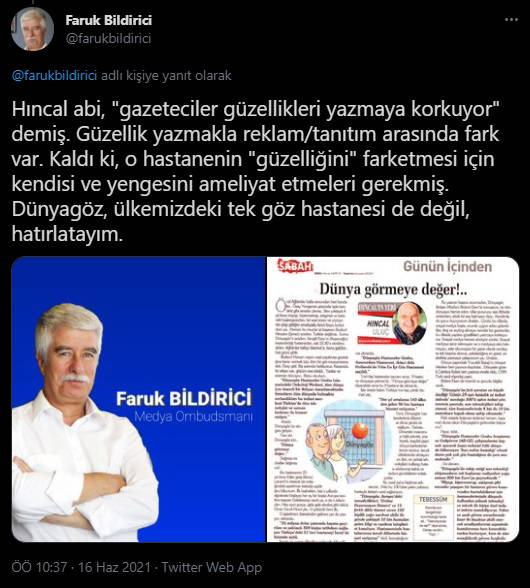 "Hıncal abi, "gazeteciler güzellikleri yazmaya korkuyor" demiş. Güzellik yazmakla reklam/tanıtım arasında fark var. Kaldı ki, o hastanenin "güzelliğini" farketmesi için kendisi ve yengesini ameliyat etmeleri gerekmiş. Dünyagöz, ülkemizdeki tek göz hastanesi de değil, hatırlatayım."