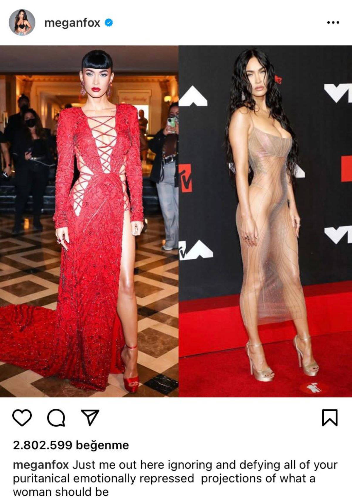 NTV’nin aktardığına göre, Fox kıyafetiyle ilgili olumsuz eleştirilere Instagram hesabı üzerinden yanıt verdi. MTV ödül gecesi ve Met Gala'da çekilen iki fotoğrafını yan yana paylaşan Fox, "Bir kadının nasıl olması gerektiğine ilişkin tutucu, duygusal anlamda bastırılmış fikirlerinizi görmezden geliyorum ve meydan okuyorum" mesajını yazdı.