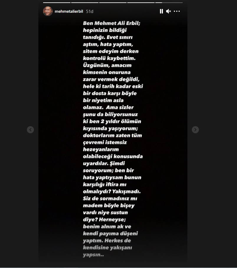 "Ben Mehmet Ali Erbil, hepinizin bildiği tanıdığı. Evet sınırı aştım, hata yaptım, sitem edeyim derken kontrolü kaybettim. Üzgünüm, amacım kimsenin onuruna zarar vermek değildi, hele ki tarih kadar eski bir dosta karşı böyle bir niyetim asla olamaz. Ama sizler şunu da biliyorsunuz ki ben 2 yıldır ölümün kıyısında yaşıyorum; doktorlarım zaten tüm çevremi istemsiz hezeyanlarım olabileceği konusunda uyardılar. Şimdi soruyorum; ben bir hata yaptıysam bunun karşılığı iftira mı olmalıydı? Yakışmadı. Siz de sormadınız mı, madem böyle birşey vardı, niye sustun diye? Her neyse benim alnım ak ve kendi payıma düşeni yaptım. Herkes de kendine yakışanı yapsın..."