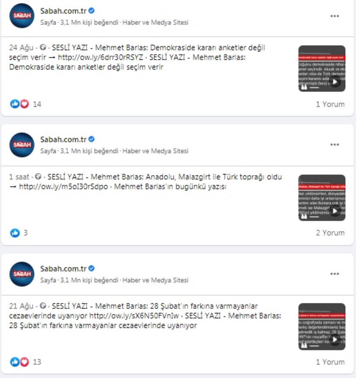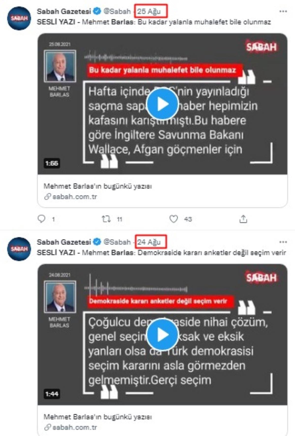 Twitter'da arandığında Barlas'ın 19-20 ve 21 Ağustos ile 24-25 Ağustos tarihli ve bugünkü yazılarına ulaşılabilirken ilgili yazılar için olumlu bir sonuç elde edilemiyor.