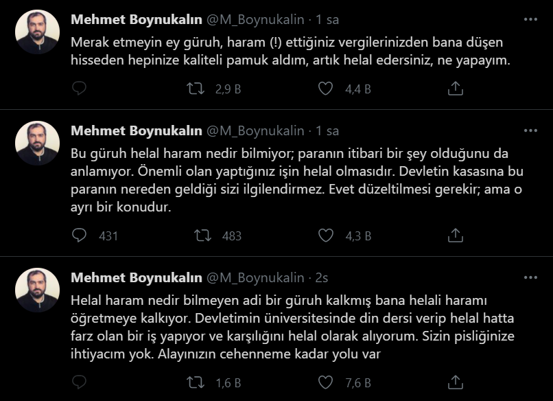 Boynukalın yaptığı paylaşımda, "Helal haram nedir bilmeyen adi bir güruh kalkmış bana helali haramı öğretmeye kalkıyor. Devletimin üniversitesinde din dersi verip helal hatta farz olan bir iş yapıyor ve karşılığını helal olarak alıyorum. Sizin pisliğinize ihtiyacım yok. Alayınızın cehenneme kadar yolu var" ifadelerini kullandı.
