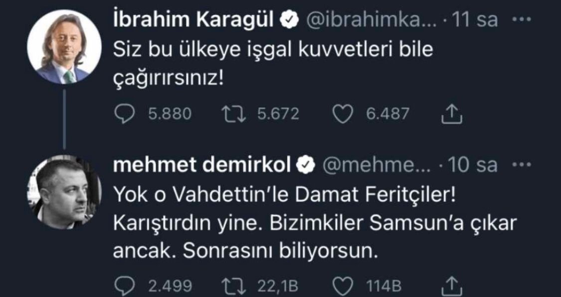 Demirkol, sosyal medya hesabından Karagül'ün gönderisinin altına "Yok o Vahdettin'le Damat Feritçiler! Karıştırdın yine. Bizimkiler Samsun'a çıkar ancak. Sonrasını biliyorsun." şeklinde yanıt verdi.