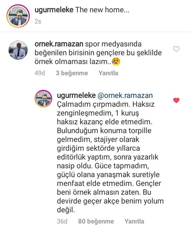 Gazeteci Uğur Meleke, kişisel Instagram adresinden paylaştığı içkili fotoğrafa gelen, "Spor medyasında beğenilen birisinin gençlere bu şekilde örnek olmaması lazım" yorumuna, "Çalmadım çırpmadım. Gençler beni örnek almasın zaten, bu devirde geçer akçe benim yolum değil" yanıtını verdi.
