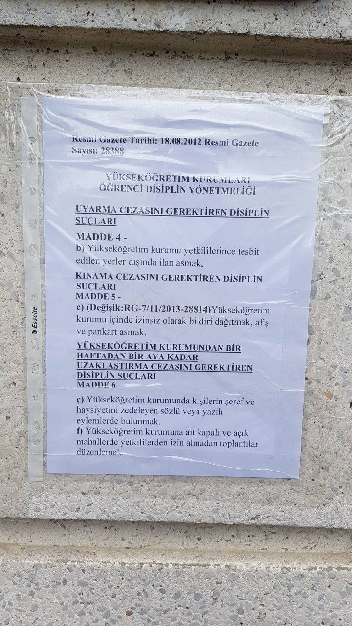 Kağıtta, belirlenen yerler dışına asılan afişlerin uyarı, izinsiz bildiri ve afiş dağıtımının kınama; izinsiz toplantıların ise uzaklaştırma ile cezalandırılacağı vurgulandı.