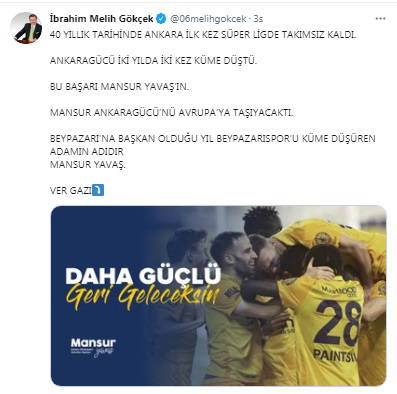 “40 yıllık tarihinde Ankara İlk Kez Süper Ligde takımsız kaldı. Ankaragücü iki yılda iki kez küme düştü. Bu başarı Mansur Yavaş’ın. Mansur Ankaragücü’nü Avrupa’ya taşıyacaktı. Beypazarı’na başkan olduğu yıl Beypazarıspor’u küme düşüren adamın adıdır Mansur Yavaş. Ver gazı.”