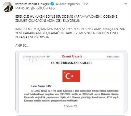 Eski Ankara Büyükşehir Belediyesi Başkanı Melih Gökçek ise konuya ilişkin 23 Ocak 2021 tarihinde Resmi Gazete'de yayımlanan, AKP'li Cumhurbaşkanı Recep Tayyip Erdoğan imzalı kararnameyi paylaşıp Yavaş'ı hedef aldı.