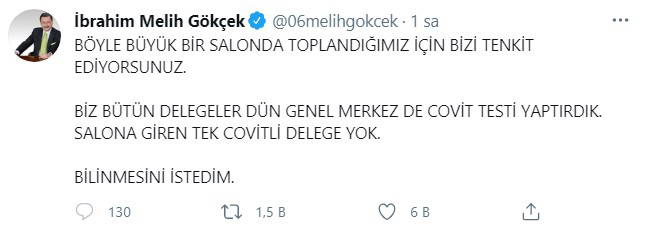 "Böyle bir salonda toplandığımız için bizi tenkit ediyorsunuz. Biz bütün delegeler dün Genel Merkez'de Covid testi yaptırdık. Salona giren tek Covid'li delege yok. Bilinmesini istedim" dedi.