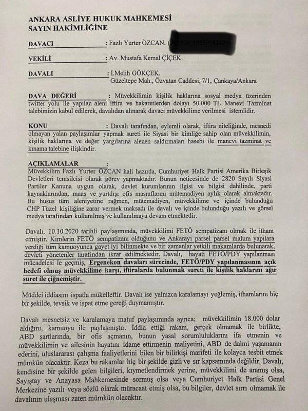 CHP ABD Temsilcisi Yurter Özcan, avukatı aracılığıyla sunduğu dava dilekçesinde, FETÖ’nün Ergenekon kumpası döneminde hedef olduğunu belirtmişti.