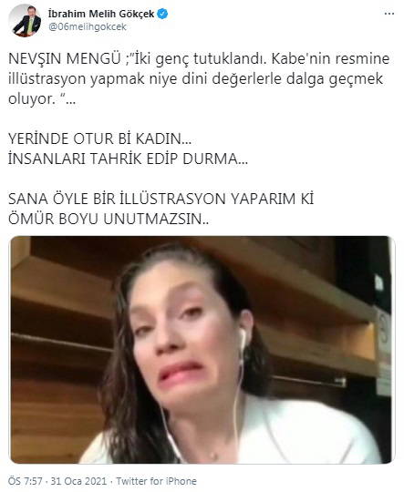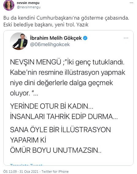 Gökçek ise bu sözler üzerinden Nevşin Mengü'yü hedef aldığı paylaşımında Mengü'ye "Otur yerinde be kadın... İnsanları tahrik edip durma" diye seslenip "Sana öyle bir illüstrasyon yaparım ki ömür boyu unutamazsın" ifadelerini kullandı.