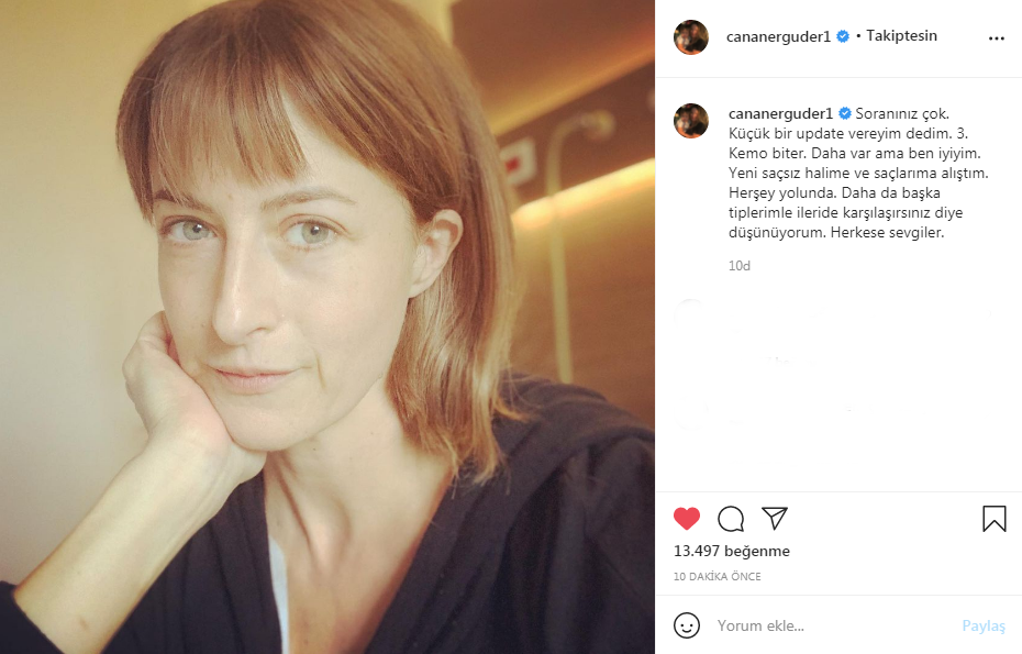 Ünlü oyuncu, Instagram hesabından yaptığı paylaşımda, tedavinin seyrine ve kendisini nasıl hissettiğine dair açıklamalarda bulundu. Ergüder, 3. kemoterapinin bittiğini ve her şeyin yolunda olduğunu belirtti.