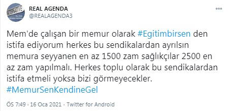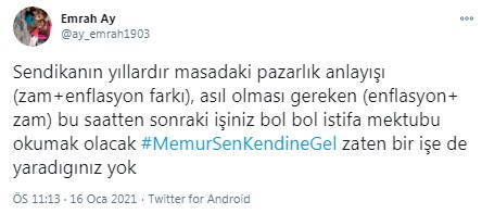 İstenen zammın yetersizliğine isyan eden kamu emekçileri, sosyal medyada #MemurSenKendineGel diye etiket açarak tepkilerini dile getirdi.