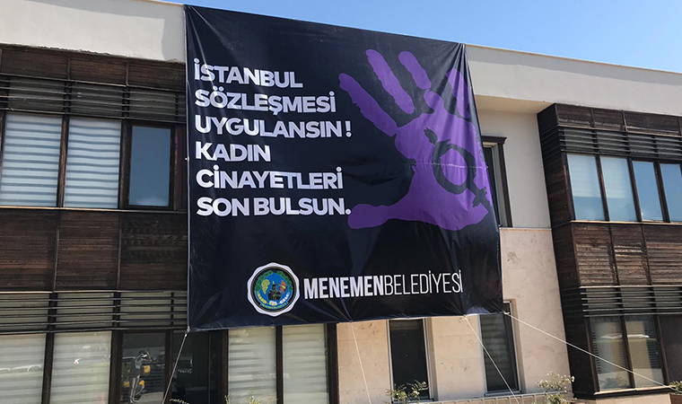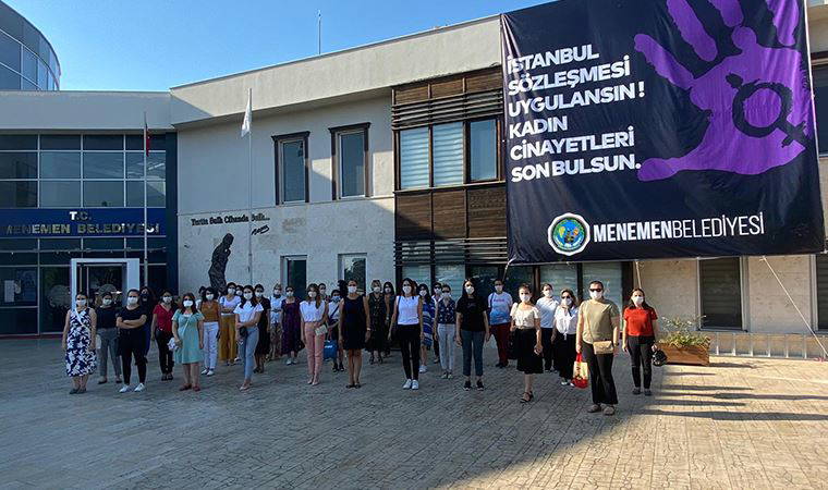 Menemen Belediyesi binasına ise “İstanbul Sözleşmesi uygulansın! Kadın cinayetleri son bulsun!” pankartı asıldı. Menemen Belediyesi’nin kadın çalışanları da kadın cinayetlerine tepkilerini pankart önünde sessiz eylem yaparak gösterdiler.