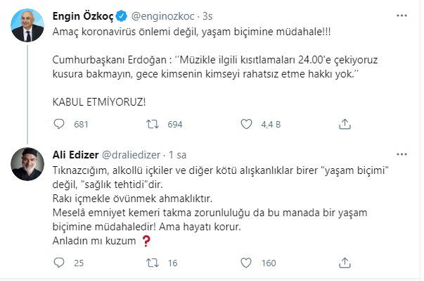 CHP Grup Başkanvekili ve Sakarya Milletvekili Engin Özkoç da, sosyal medya hesabı üzerinden Erdoğan'ın tepkilere yol açan sözleri için, "Amaç koronavirüs önlemi değil, yaşam biçimine müdahale!!! Cumhurbaşkanı Erdoğan : ‘’Müzikle ilgili kısıtlamaları 24.00'e çekiyoruz kusura bakmayın, gece kimsenin kimseyi rahatsız etme hakkı yok.’’ KABUL ETMİYORUZ!" ifadelerini kullandı.
