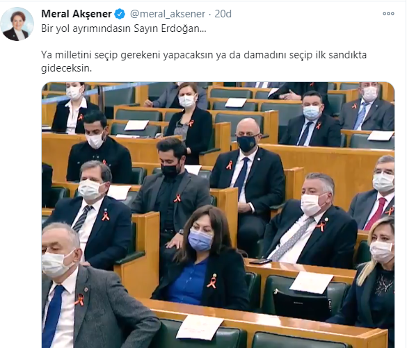 Hazine ve Maliye Bakanı Berat Albayrak resmi instagram hesabı üzerinden istifa etti. İstifanın ardından AKP'den resmi bir açıklama gelmedi. İYİ Parti Genel Başkanı Meral Akşener, Albayrak'ın istifasının üzerinden AKP'li Cumhurbaşkanı Erdoğan'a çağrıda bulundu. Akşener, "Bir yol ayrımındasın Sayın Erdoğan... Ya milletini seçip gerekeni yapacaksın ya da damadını seçip ilk sandıkta gideceksin" ifadelerini kullandı.