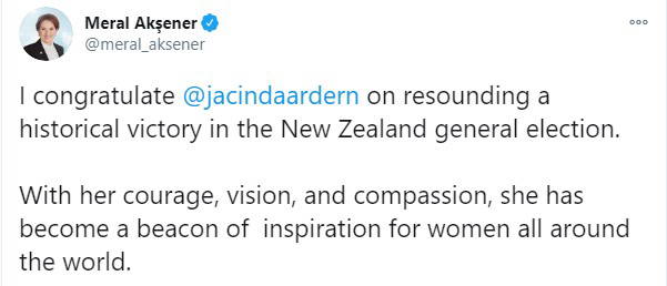 Akşener, "Tebrik ederim @jacindaardern Yeni Zelanda genel seçimlerinde tarihi bir zaferin yankılanması üzerine. Cesareti, vizyonu ve şefkatiyle dünyanın her yerindeki kadınlar için bir ilham kaynağı oldu" diye konuştu.
