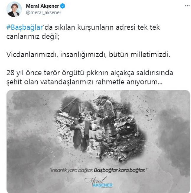 Sosyal medya hesabından açıklama yapan Akşener mesajında, "Başbağlar’da sıkılan kurşunların adresi tek tek canlarımız değil; Vicdanlarımızdı, insanlığımızdı, bütün milletimizdi. 28 yıl önce terör örgütü pkknın alçakça saldırısında şehit olan vatandaşlarımızı rahmetle anıyorum" ifadelerini kullandı.