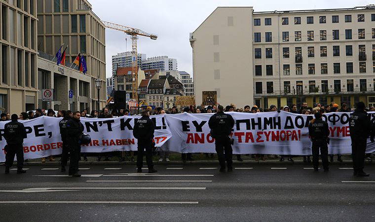 Yunanistan’daki sığınmacıların durumuna ilişkin fotoğraflar gösteren protestocular "Sınırları aç, Hayat kurtar, faşizmle mücadele et", "Duvarlar değil köprüler kur", "Avrupa harekete geç" ve "Yazıklar olsun" yazılı dövizler taşıdı. Gösterisi sırasında yapılan konuşmalarda 'AB’nin insanlık dışı siyasetini sürdürdüğü' sırada Merkel ve Miçotakis’in ekonomik iş birliği konusunda 'sakin bir şekilde' görüşmeler yaptığı belirtildi. Konuşmalarda Yunanistan’ın sığınmacılara ateş açması ve AB ile Almanya’nın Yunanistan’a maddi destek vermesi eleştirildi.