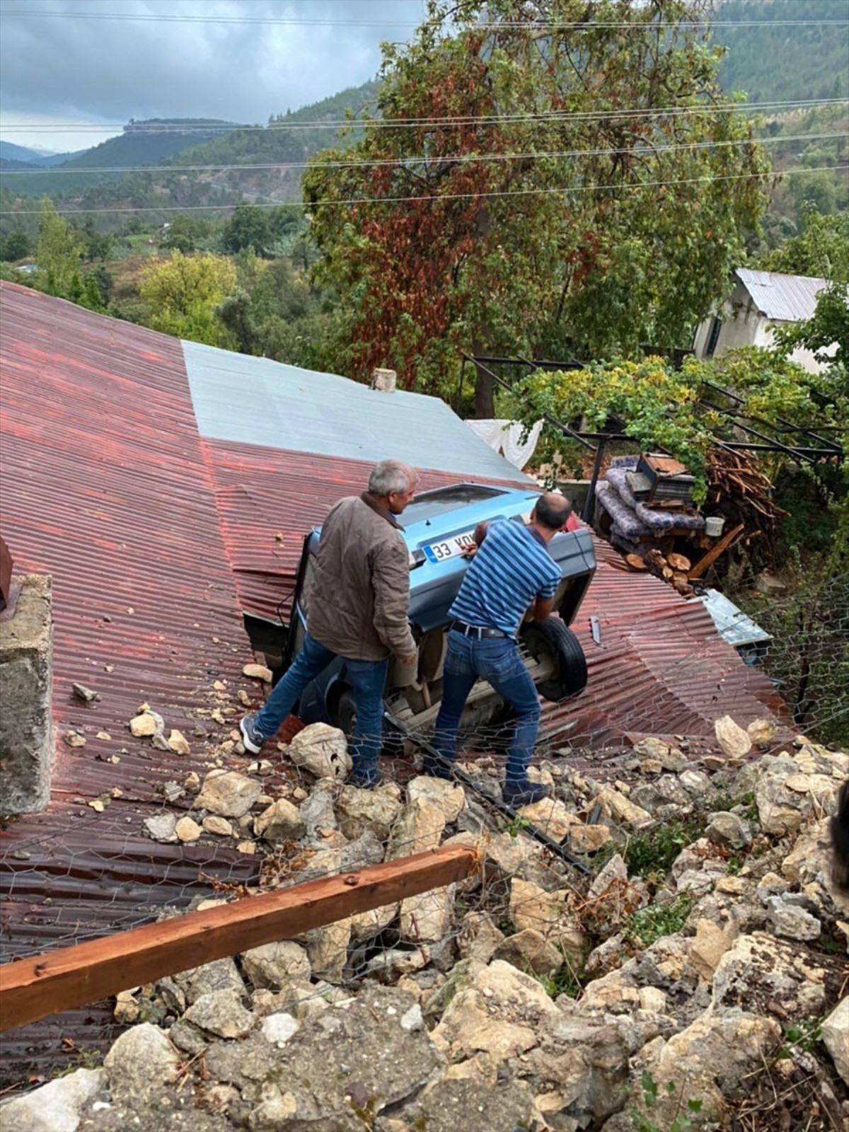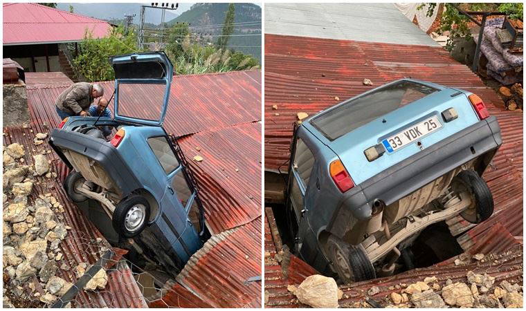Osman S'nin (23) kullandığı 33 VDK 25 plakalı otomobil, yağış nedeniyle Sinap Mahallesi'nde kontrolden çıktı. Yokuş aşağı hızlanan araç, boş bir evin çatısına düştü.