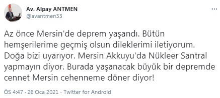 Depremin ardından Mersin'de yapımı süren Akkuyu Nükleer Santrali inşaatının oluşturduğu risk de tekrar gündeme geldi. CHP Mersin Milletvekili Alpay Antmen, konuyla ilgili paylaşım yaparak "Doğa bizi uyarıyor. Mersin Akkuyu'da Nükleer Santral yapmayın diyor. Burada yaşanacak büyük bir depremde cennet Mersin cehenneme döner diyor!" ifadelerini kullandı.