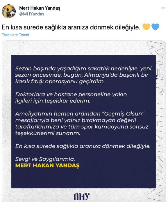 “Geçmiş olsun Mert Hakan Yandaş. Futbol A Takım sporcularımızdan Mert Hakan Yandaş başarılı bir kasık fıtığı operasyonu geçirmiştir. Oyuncumuz taburcu edilmiş olup, tedavisine başlanmıştır.”