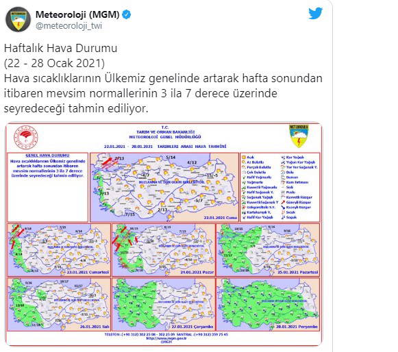 22 - 28 Ocak 2021 verilerini yayınlayan Meteoroloji, ülkede don ve buzlanma devam ederken, bugünden itibaren Türkiye'nin batısında sıcaklıkların 4-5 derece artacağını bildirdi.