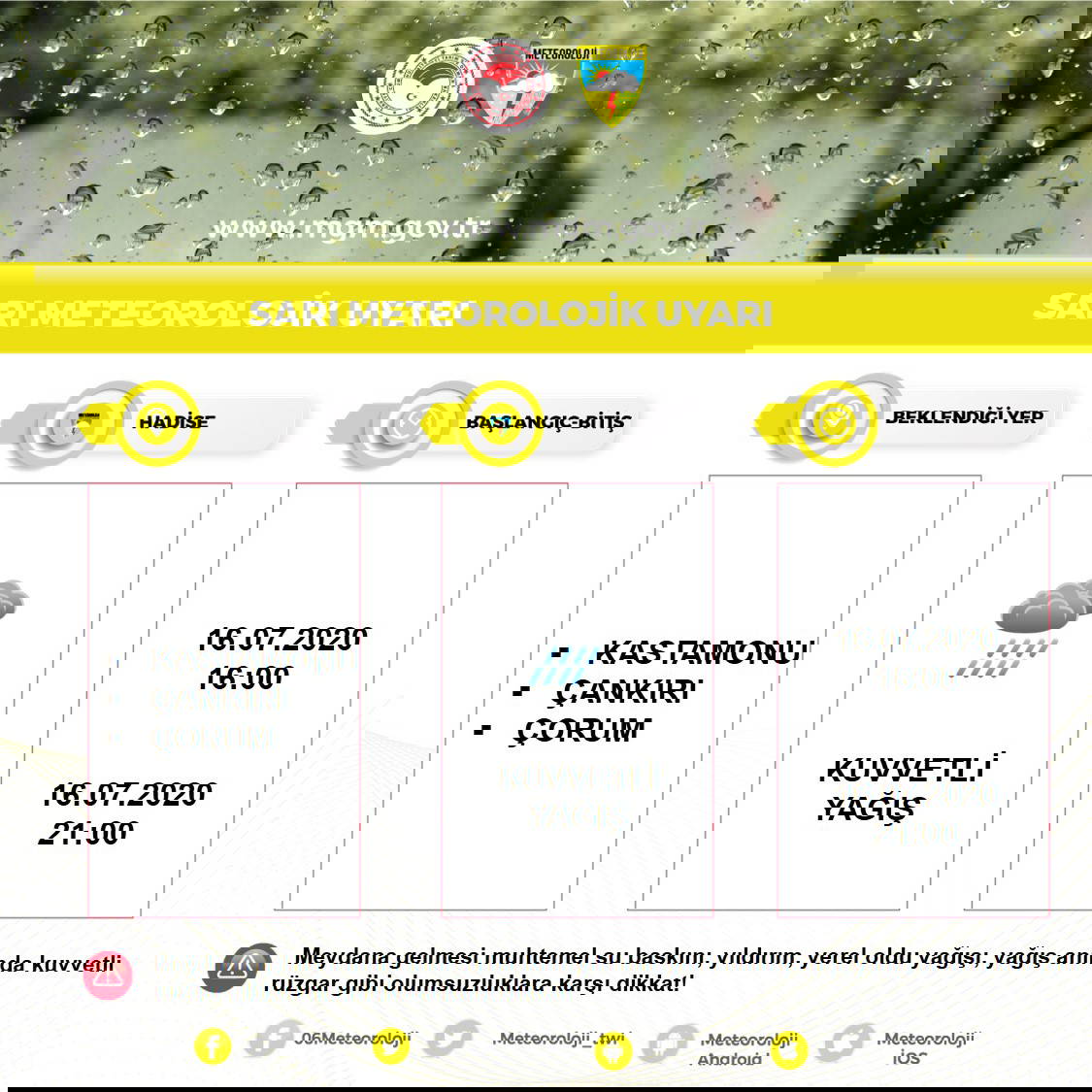 "Yapılan son değerlendirmelere göre; bugün akşam saatlerine kadar, Çankırı çevreleri, güney ilçeleri başta olmak üzere Kastamonu ile Çorum'un kuzey ilçelerinde yerel olarak kuvvetli sağanak ve gök gürültülü sağanak yağış beklendiğinden su baskını, yıldırım, yerel oldu yağışı, yağış anında kuvvetli rüzgar gibi olumsuzluklara karşı dikkatli ve tedbirli olunmalıdır."