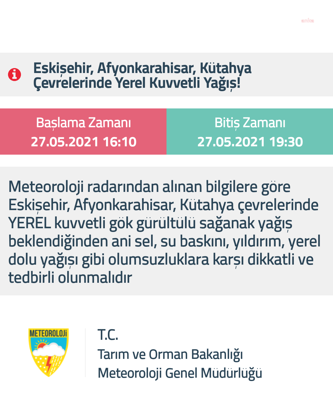 "Meteoroloji radarından alınan bilgilere göre, Eskişehir, Afyonkarahisar, Kütahya çevrelerinde YEREL kuvvetli gök gürültülü sağanak yağış beklendiğinden ani sel, su baskını, yıldırım, yerel dolu yağışı gibi olumsuzluklara karşı dikkatli ve tedbirli olunmalıdır."