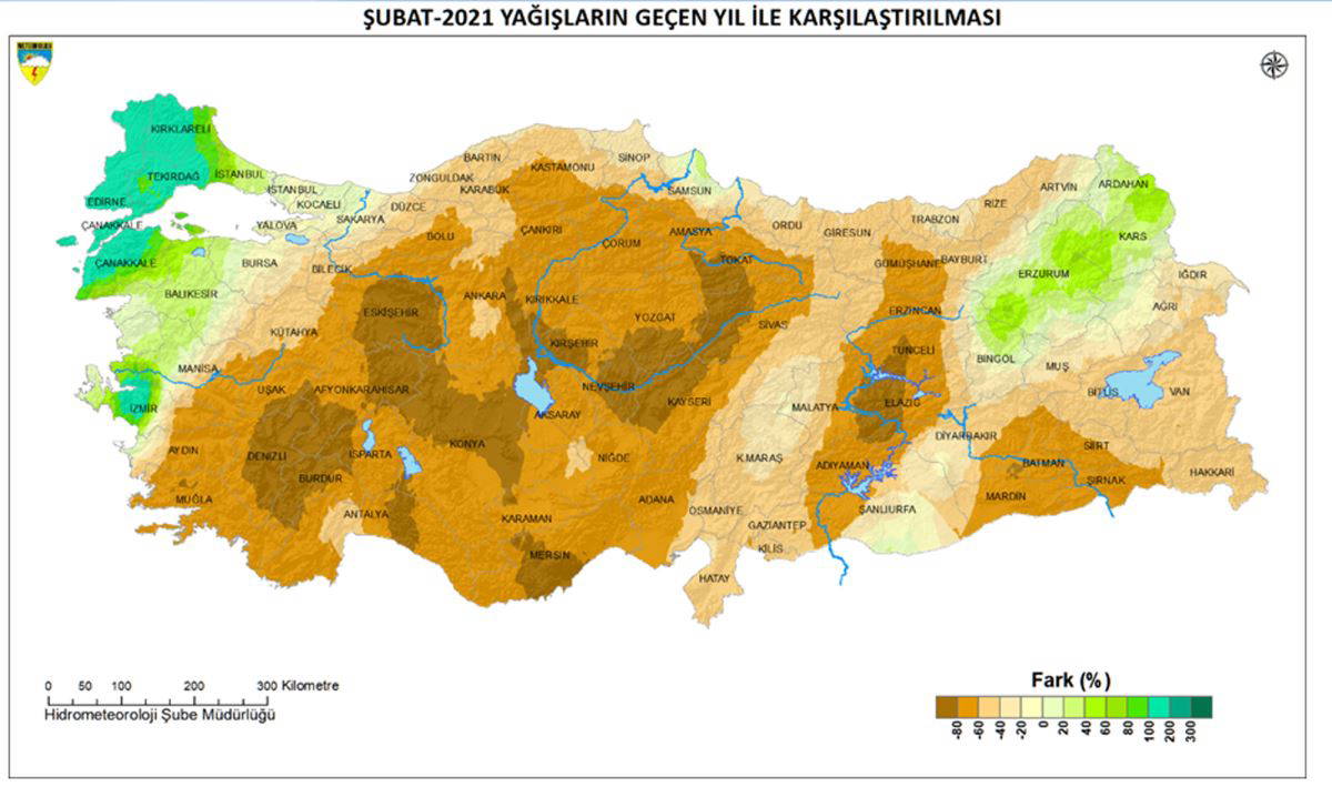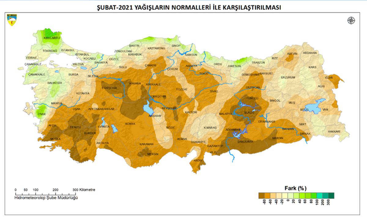 Meteoroloji Genel Müdürlüğü'nün 2021 yılı Şubat ayı alansal yağış değerlendirmesine göre ise Türkiye geneli şubat ayı yağışları ve normali, geçen yıl yağışlarının altında gerçekleşti.