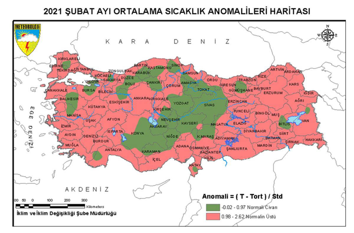Meteoroloji Genel Müdürlüğü'nce, 2021 yılı şubat ayı ortalama sıcaklıklarının, 1981- 2010 normallerine göre mukayesesini içeren analizi hazırlandı. 2021 yılı şubat ayında ortalama sıcaklıklar Sakarya, Bursa, Balıkesir, Lüleburgaz, Akhisar, Beyşehir, Antakya, Göksun, Elmalı, İç Anadolu bölgesi geneli, Bolu, Kastamonu, Karabük, Merzifon, Amasya, Tokat, Gümüşhane, Boyabat, Nallıhan, Zile, Bitlis, Divriği, Muradiye, Elbistan çevrelerinde mevsim normalleri civarında seyretti. Ortalama sıcaklıklar, yurdun diğer bölgelerinde mevsim normallerinin üzerinde gerçekleşti.