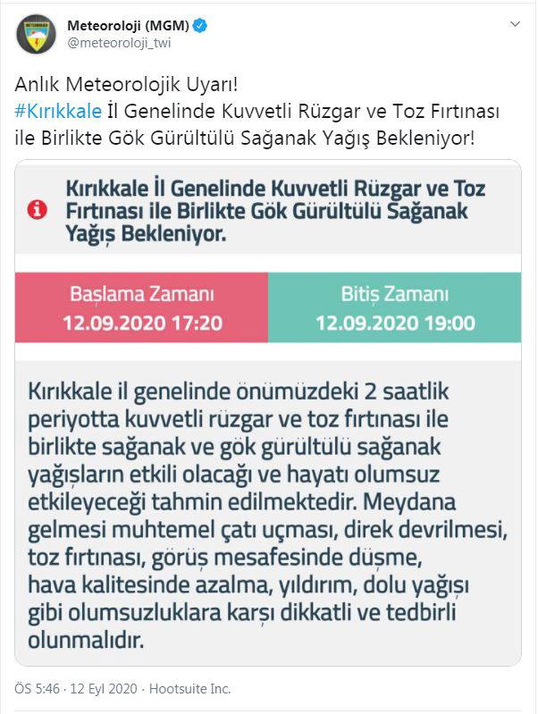 Meteoroloji Genel Müdürlüğü'nün Twitter hesabından yapılan açıklamada, "Kırıkkale il genelinde önümüzdeki 2 saatlik periyotta kuvvetli rüzgar ve toz fırtınası ile birlikte sağanak ve gök gürültülü sağanak yağışların etkili olacağı ve hayatı olumsuz etkileyeceği tahmin edilmektedir. Meydana gelmesi muhtemel çatı uçması, direk devrilmesi, toz fırtınası, görüş mesafesinde düşme, hava kalitesinde azalma, yıldırım, dolu yağışı gibi olumsuzluklara karşı dikkatli ve tedbirli olunmalıdır" denildi.