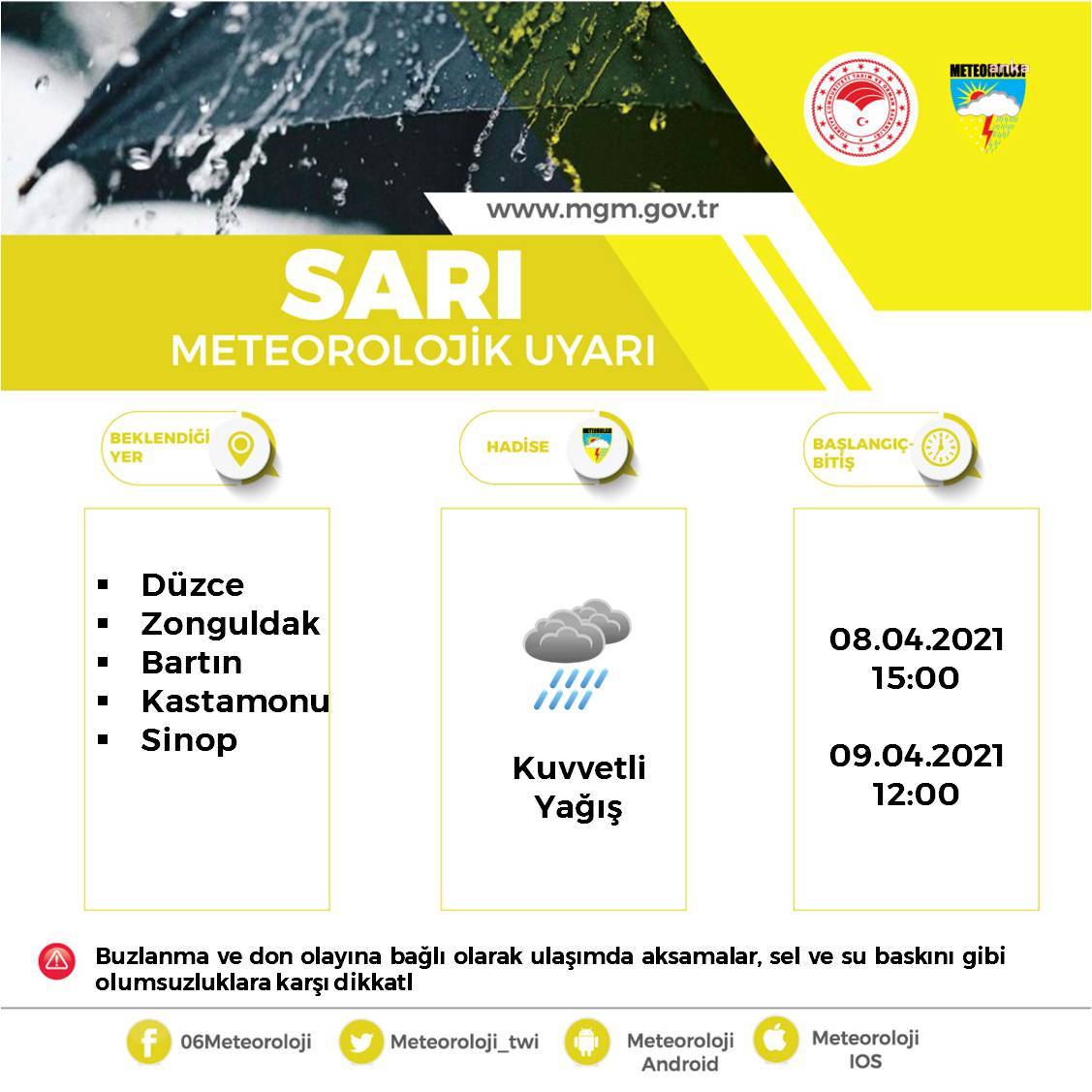 "Bugün öğle saatlerinden itibaren Batı Karadeniz kıyı kesimlerinde yağmur ve sağanak şeklinde başlayacak olan yağışların, zamanla etkisini artırarak karla karışık yağmur ve iç kesimlerinde (400 m üzeri) yoğun kar şeklinde olması beklendiğinden başta buzlanma ve don olayına bağlı olarak ulaşımda aksamalar, sel ve su baskını gibi olumsuzluklara karşı dikkatli ve tedbirli olunması gerekmektedir."