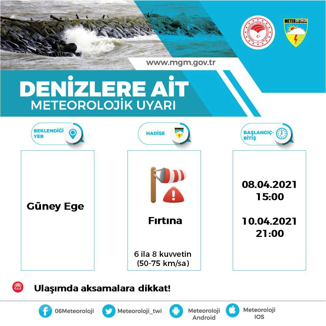 "Güney Ege'de bugün (08.04.2021 Perşembe) öğle saatlerinden sonra kuzey ve kuzeybatı yönlerden 6 ila 8 kuvvetinde (50-75 km/sa) fırtına bekleniyor. Fırtınanın Cumartesi (10.04.2021) günü akşam saatlerinde etkisini kaybedeceği tahmin ediliyor."