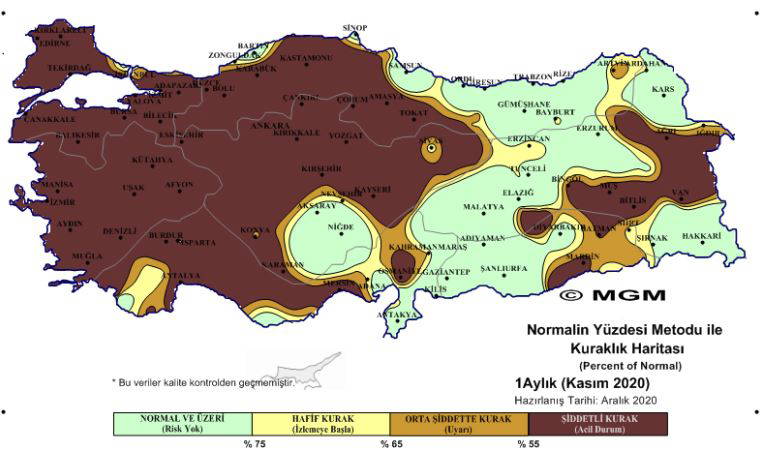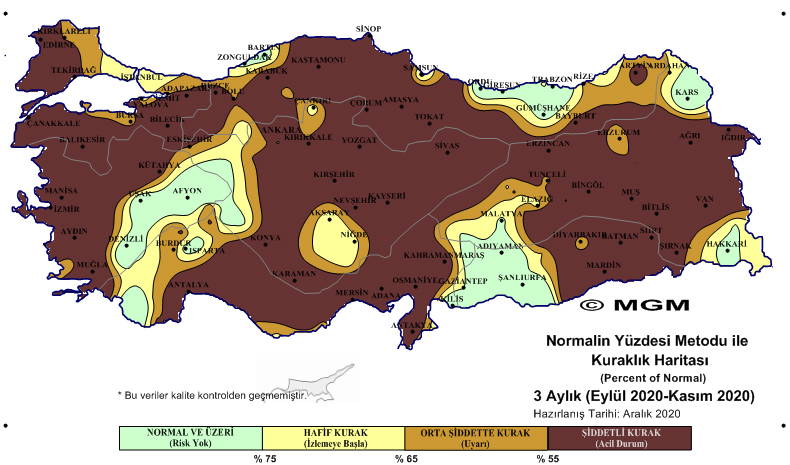 Meteoroloji Genel Müdürlüğü, Standart Yağış İndeksi (SPI - Standardized Precipitation Index) metoduna göre 2020 Eylül-Ekim-Kasım ayları meteorolojik kuraklık analizi ve Normalin Yüzdesi (PNI - Percent of Normal Index) metoduna göre, son üç aylık ve 2020 Kasım ayı meteorolojik kuraklık durumuna ilişkin haritalar yayımlandı.
