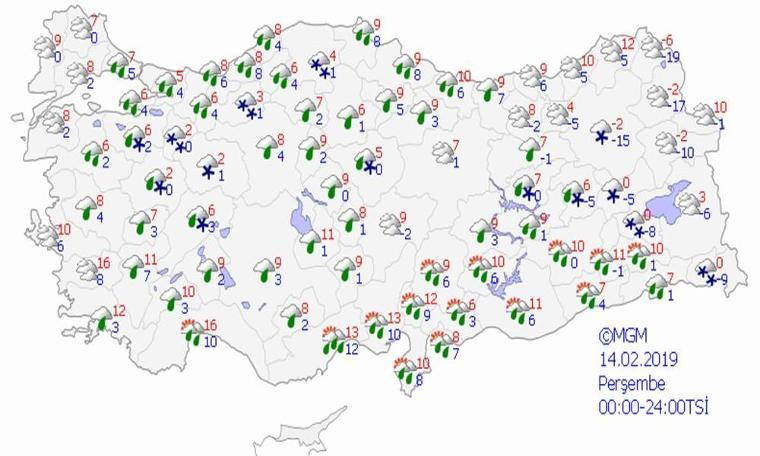 Yapılan son değerlendirmelere göre bütün bölgeler parçalı ve çok bulutlu, Marmara’nın kuzey ve doğusu, Ege, Akdeniz, İç Anadolu, Karadeniz, Doğu ve Güneydoğu Anadolu ile Çanakkale, Kütahya, Afyonkarahisar ve Muğla çevrelerinin yağışlı geçeceği tahmin ediliyor. Yağışların genellikle yağmur ve sağanak, Marmara’nın kuzey ve doğusu, Karadeniz’in iç kesimleri, İç Anadolu’nun kuzeyi, Doğu Anadolu, Güneydoğu Anadolu’nun kuzeyi ile Kütahya ve Isparta çevrelerinde karla karışık yağmur ve kar şeklinde olması bekleniyor. Yağışların Sakarya’nın iç kesimleri ile Mersin çevrelerinde yerel olarak kuvvetli olacağı tahmin ediliyor. Sabah ve gece saatlerinde İç Anadolu’nun doğusu, Doğu Anadolu’nun kuzey kesimleri ile Marmara’nın kuzey ve doğusunda buzlanma ve don olayı bekleniyor.