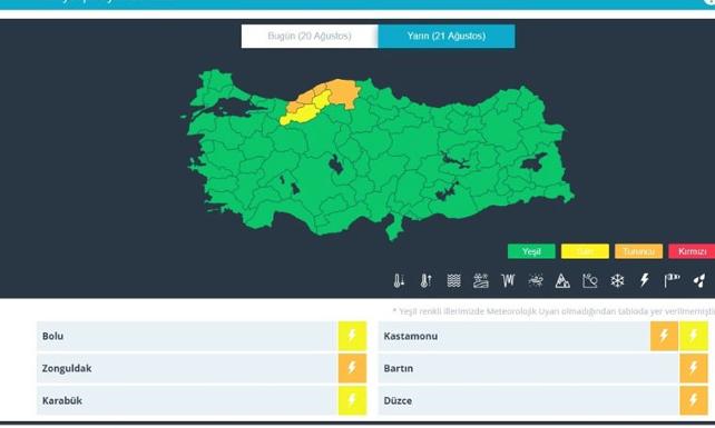 Geçtiğimiz ay Düzce'ye metrekareye 161 kilogram yağış düşmüş, Esmahanım ve Uğurlu köyü başta olmak üzere Akçakoca ve Cumayeri ilçelerinde sel felaketi meydana gelmişti. Düzce Valiliği yarın Düzce için yağış uyarısında bulundu. Metrekareye 51 ila 75 kilogram yağış düşeceği, ani sel, su baskını, yıldırım, ulaşımda aksamalar veya heyelan meydana gelebileceği ilgililerin tedbirli olması istendi. Meteoroloji Genel Müdürlüğü tarafından oluşturulan 21 Ağustos tarihli haritada ise Düzce turun alan ilan edildi. Düzce dışında Zonguldak, Bartın ve Kastamonu’da turuncu alan ilan edildi. Ayrıca Bolu ve Karabük’te sarı alan ilan edildi. Turuncu alan uyarısında ise : 'Hava durumu tehlikelidir: Tahmin edilen meteorolojik hadise sıklıkla görülmemektedir. Hasar ve kayıpların oluşması muhtemeldir. Çok tedbirli olmalı, güncel meteorolojik koşullar ve tahminler takip edilmelidir.' denildi.