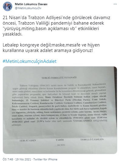 Metin Lokumcu Davası için açılan sosyal medya hesabından yapılan açıklamada karara tepki gösterilerek “Lebalep kongreye değil; maske, mesafe ve hijyen kurallarına uyarak adalet aramaya gidiyoruz! #MetinLokumcuİçinAdalet” denildi.
