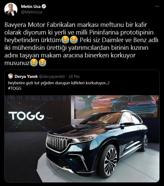 "Bavyera Motor Fabrikaları markası meftunu bir kafir olarak diyorum ki yerli ve milli Pininfarina prototipinin heybetinden ürktüm. Peki siz Daimler ve Benz adlı iki mühendisin ürettiği yatırımcılardan birinin kızının adını taşıyan makam aracına binerken korkuyor musunuz?"